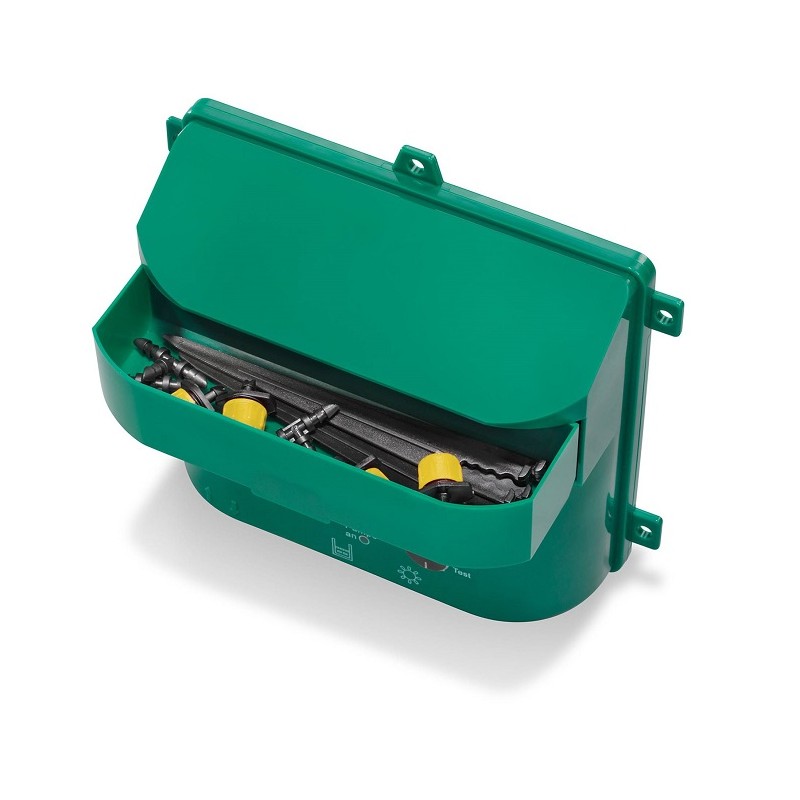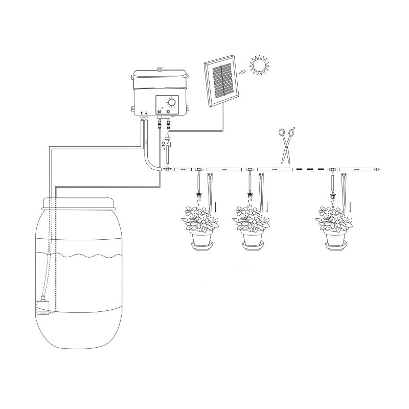 Kompaktní skříň čerpadla Esotec zavlažovacího systému nasává vodu a rozvádí ke kapačům.Hadice se snímačem hladiny vody je vložena do barelu s čistou vodou. Flexibilní zavlažovací hadice lze snadno zkrátit na požadovanou délku a vzdálenosti od rostliny k rostlině.